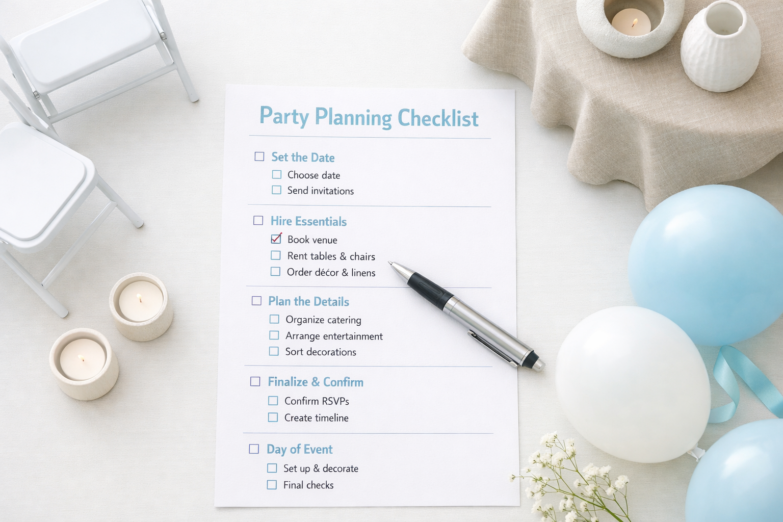 2. Core Party Hire Essentials (3–6 weeks out)